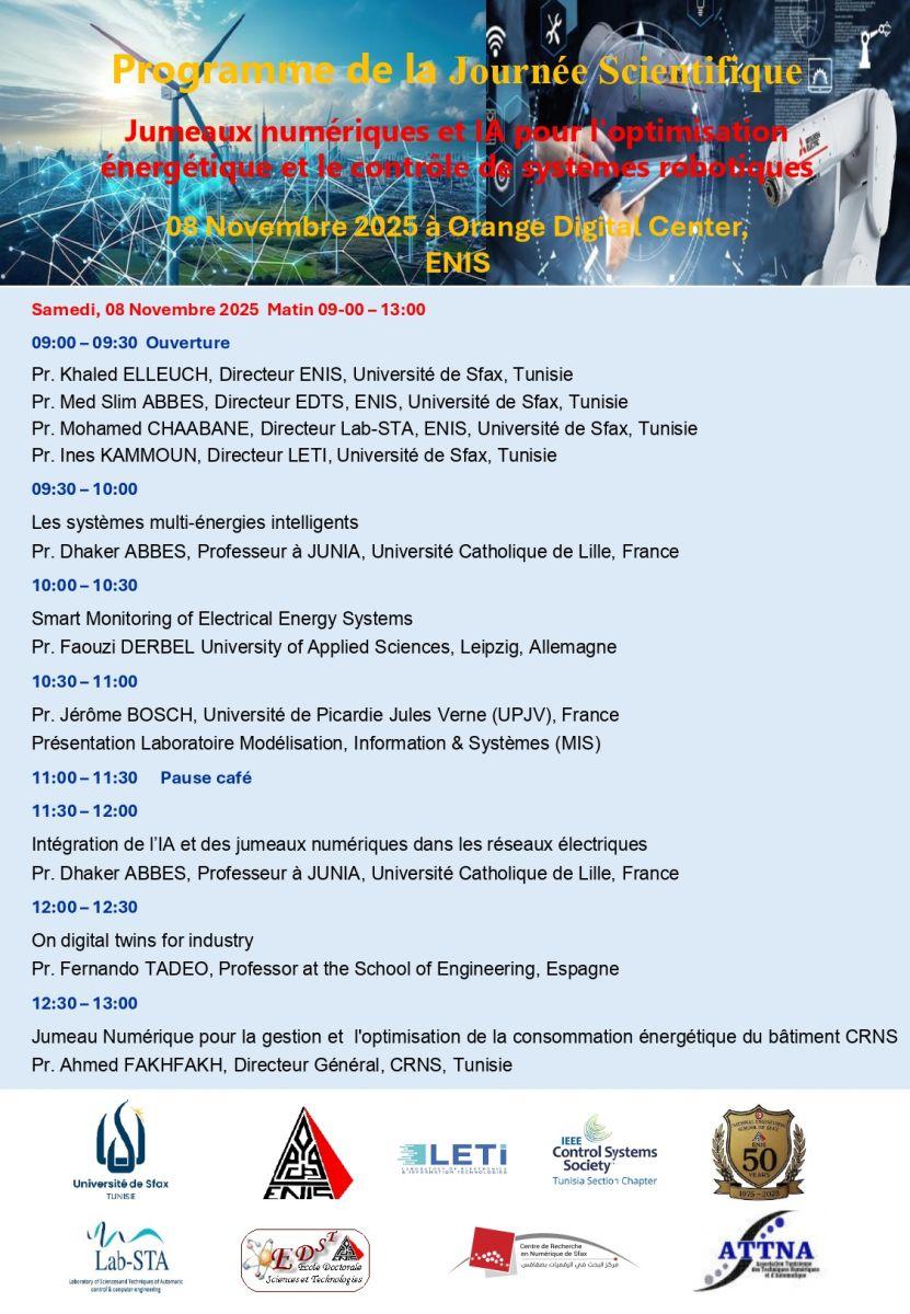 Nous serons ravis de vous compter parmi nous pour célébrer ensemble cette étape importante de l’histoire de l’ENIS et découvrir les dernières avancées en matière de jumeaux numériques et d’intelligence artificielle appliqués aux systèmes énergétiques et robotiques.