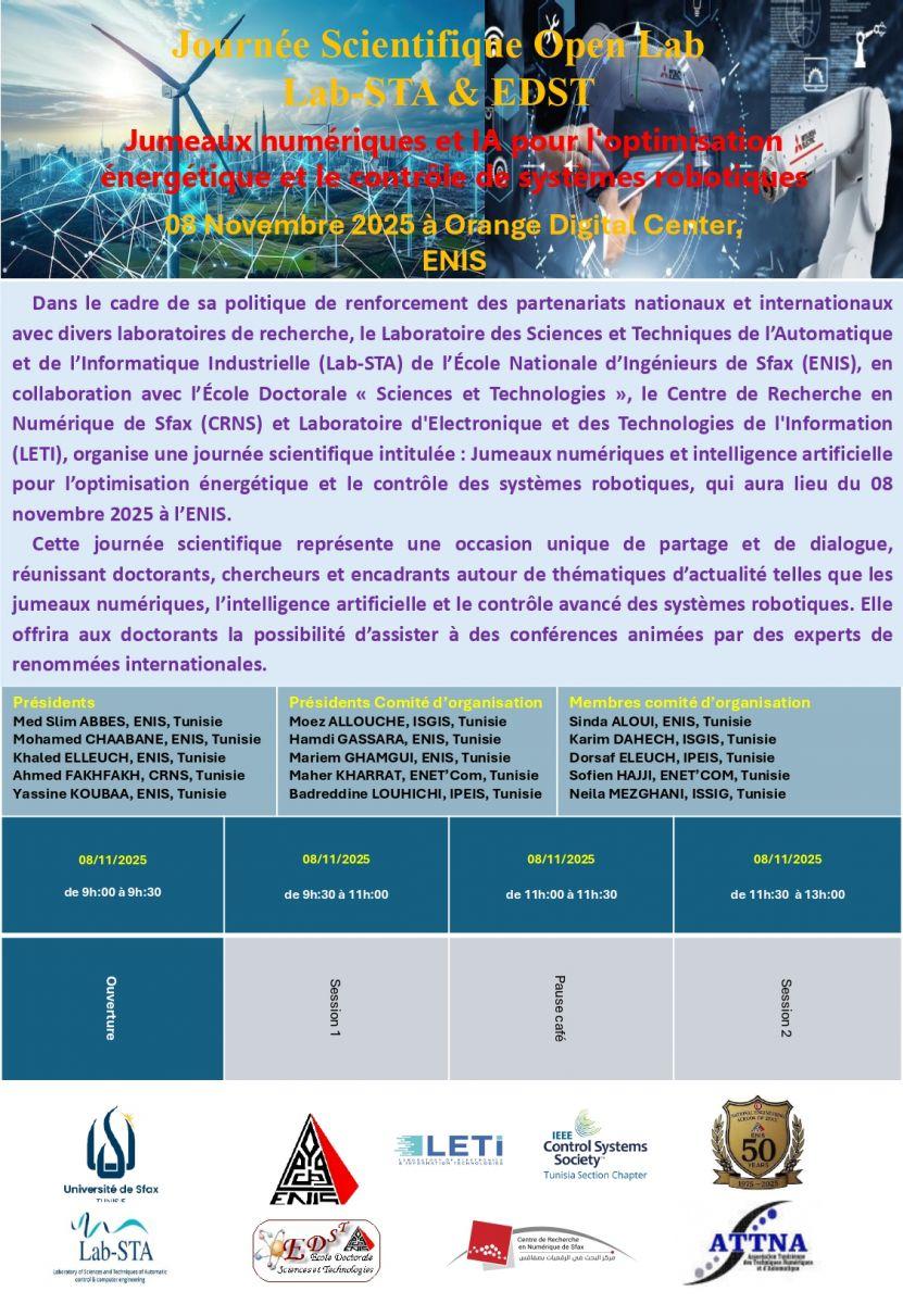 Dans le cadre des festivités du cinquantenaire de l’École Nationale d’Ingénieurs de Sfax (ENIS), le Laboratoire des Sciences et Techniques de l’Automatique et de l’Informatique Industrielle (Lab-STA), en collaboration avec l’École Doctorale Sciences et Technologies, le Centre de Recherche en Numérique de Sfax (CRNS) et le Laboratoire d’Électronique et des Technologies de l’Information (LETI), a le plaisir de vous inviter à sa Journée Scientifique Open Lab intitulée :
