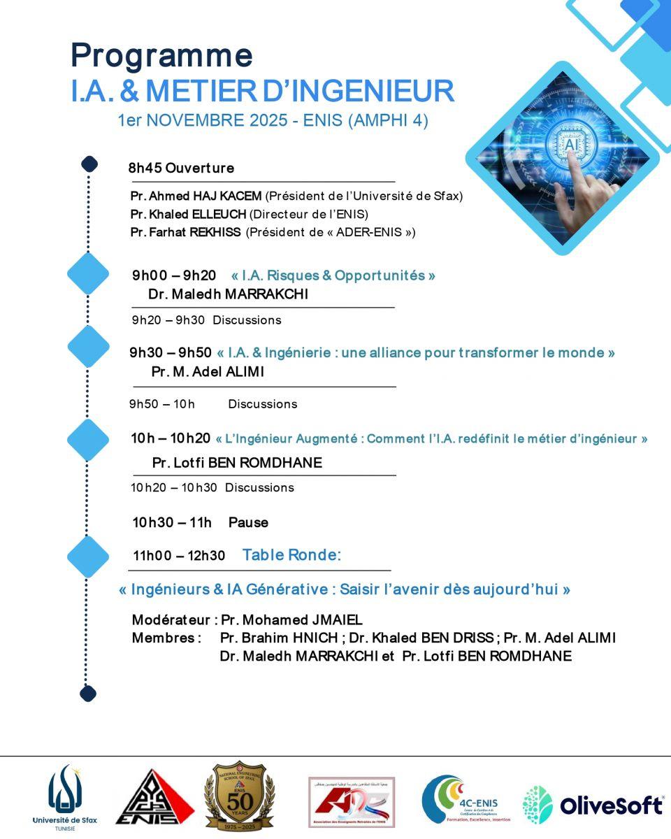 C’est dans ce sens, et à l’occasion du cinquantenaire de l’ENIS, que l’Association Des Enseignants Retraités de l’ENIS (ADER-ENIS) organise, le 1er novembre 2025, une matinée d’étude visant à mettre en exergue l’impact de l’intelligence artificielle sur le métier d’ingénieur et à dégager des recommandations pour son intégration efficace dans le processus de formation de nos futurs diplômés afin qu’ils puissent tirer parti de cette révolution et en relever les défis.