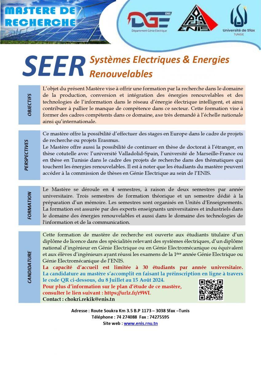 Dans le cadre des efforts entrepris par notre pays pour la diversification de ses ressources d’énergie et l’atténuation des émissions de gaz à effet de serre, des dispositions réglementaires, institutionnelles et financières ont été prises pour l’encouragement de la maîtrise de l’énergie. L’objet du présent Mastère vise à offrir une formation par la recherche dans le domaine de la production, conversion et intégration des énergies renouvelables et des technologies de l’information dans le réseau d’énergie électrique intelligent, et ainsi contribuer à palier le manque de compétence dans ce secteur.